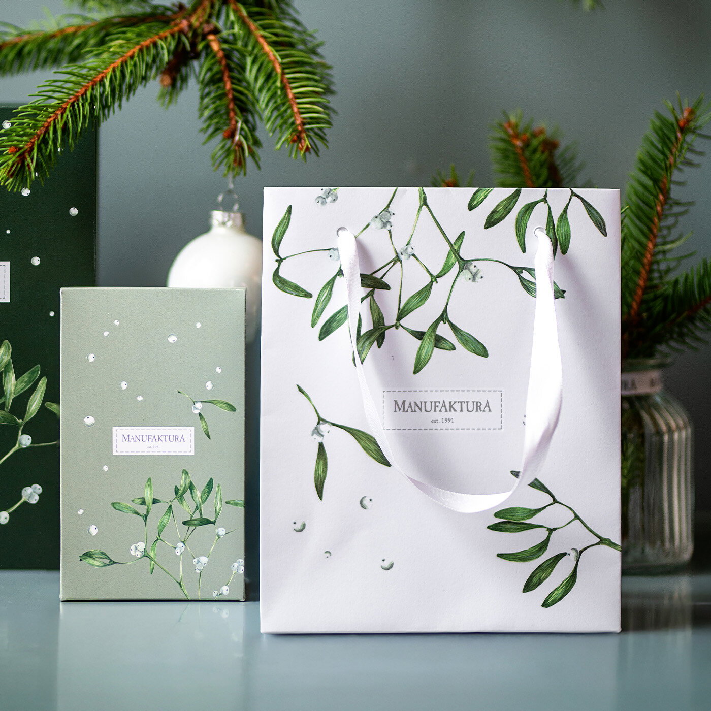 Dotáhněte svůj vánoční dárek k dokonalosti se stylovým balením! Krásná vánoční dárková taštička potěší pod stromečkem na první pohled. Jemný motiv jmelí, symbol štěstí a pohody, letos originálně namalovala naše grafička a ilustrátorka Nikol. Díky její ruční práci působí motiv osobitě, hřejivě a dokonale ladí s kouzelnou atmosférou Vánoc.
