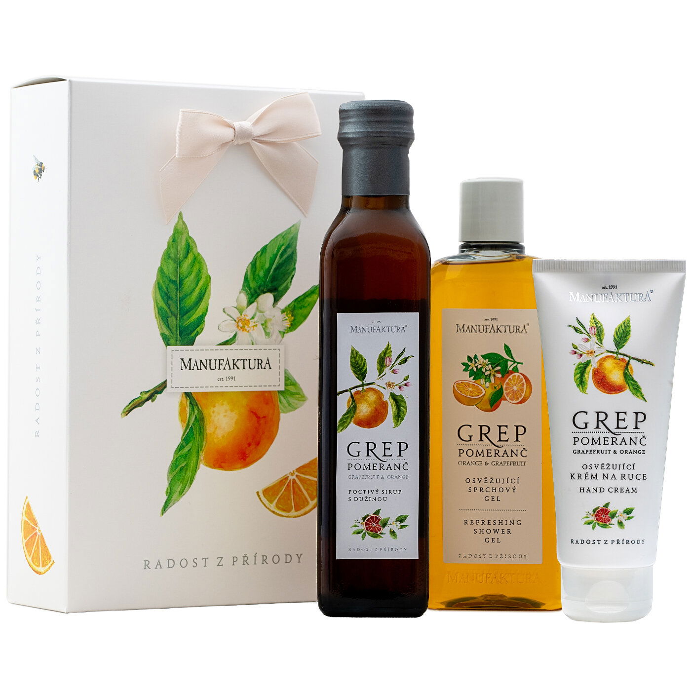 Darujte citrusové pohlazení s dotekem radosti. Spojení hořko-sladkého grepu a šťavnatého pomeranče přináší jiskřivý zážitek plný energie, který pohladí tělo a povzbudí mysl. Sprchový gel s fantastickou citrusovou vůní zajistí šetrnou očistu pokožky a zanechá ji hebkou a vláčnou, hydratační krém na ruce se postará o okamžité zvláčnění a nádherně provoněnou pokožku a poctivý sirup lahodné chuti dodá každému nápoji osvěžující citrusový nádech. Ideální balíček kosmetiky pro milovníky svěžích vůní a přirozené energie.