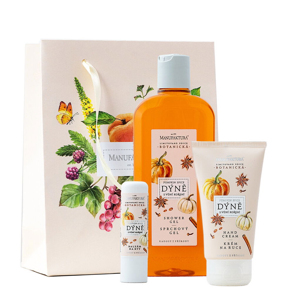 Limitovaná edice DÝNĚ s vůní koření, vytvořená ve spolupráci s Botanickou zahradou Praha, přináší harmonii péče, vůně a podzimní pohody. Tento kosmetický dárkový balíček obsahuje zvláčňující sprchový & koupelový gel, výživný & regenerační krém na ruce, balzám na rty a stylovou papírovou tašku s nádhernou autorskou akvarelovou ilustrací. Sladce kořeněná vůně připomíná chvíle u čerstvě upečeného koláče či hrnku dýňového latte a zve k podzimnímu zpomalení a relaxaci… Skvělý tip na voňavý dárek pro ženy i muže, který zahřeje u srdce.